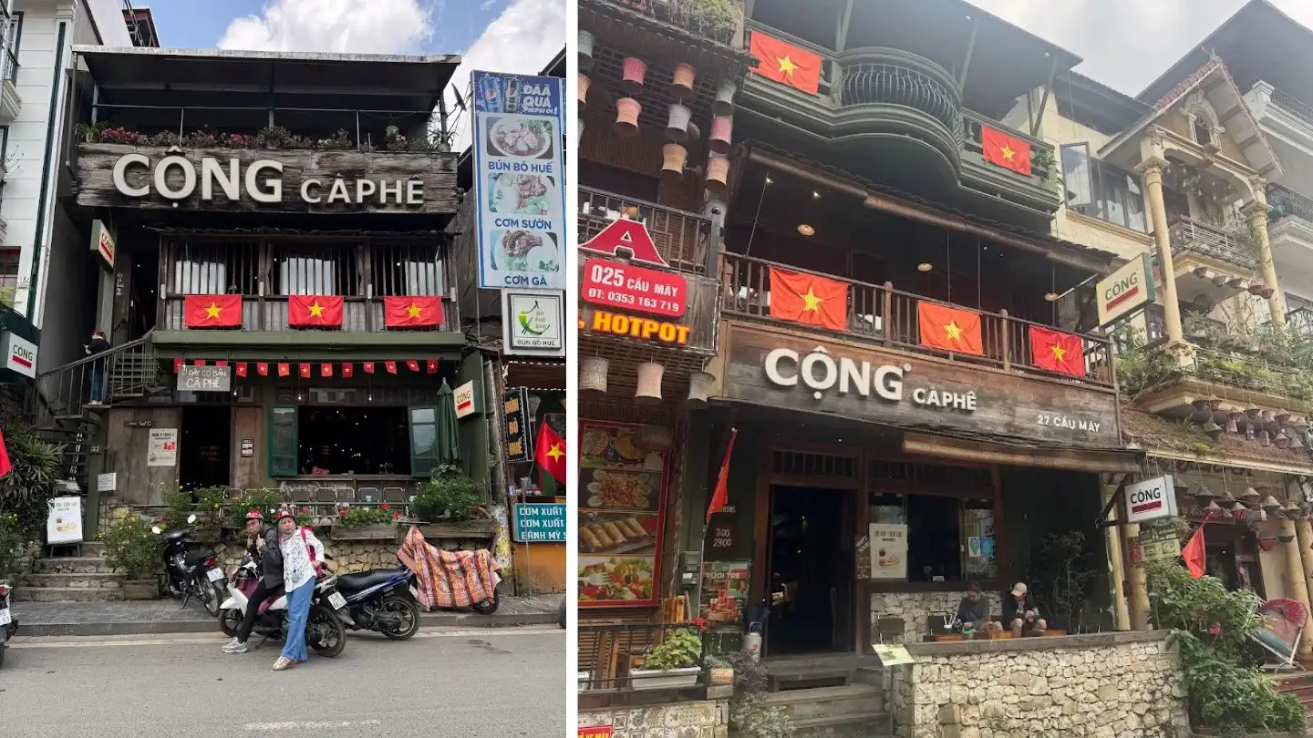 Cong Coffee in Sapa stands out with its rustic wooden facade, vintage signage, and cozy balcony draped with Vietnamese flags. The café’s design blends old-school charm with mountain-town vibes—weathered wood, potted plants, and dim warm lights create a nostalgic, welcoming look that perfectly fits Sapa’s misty streets.