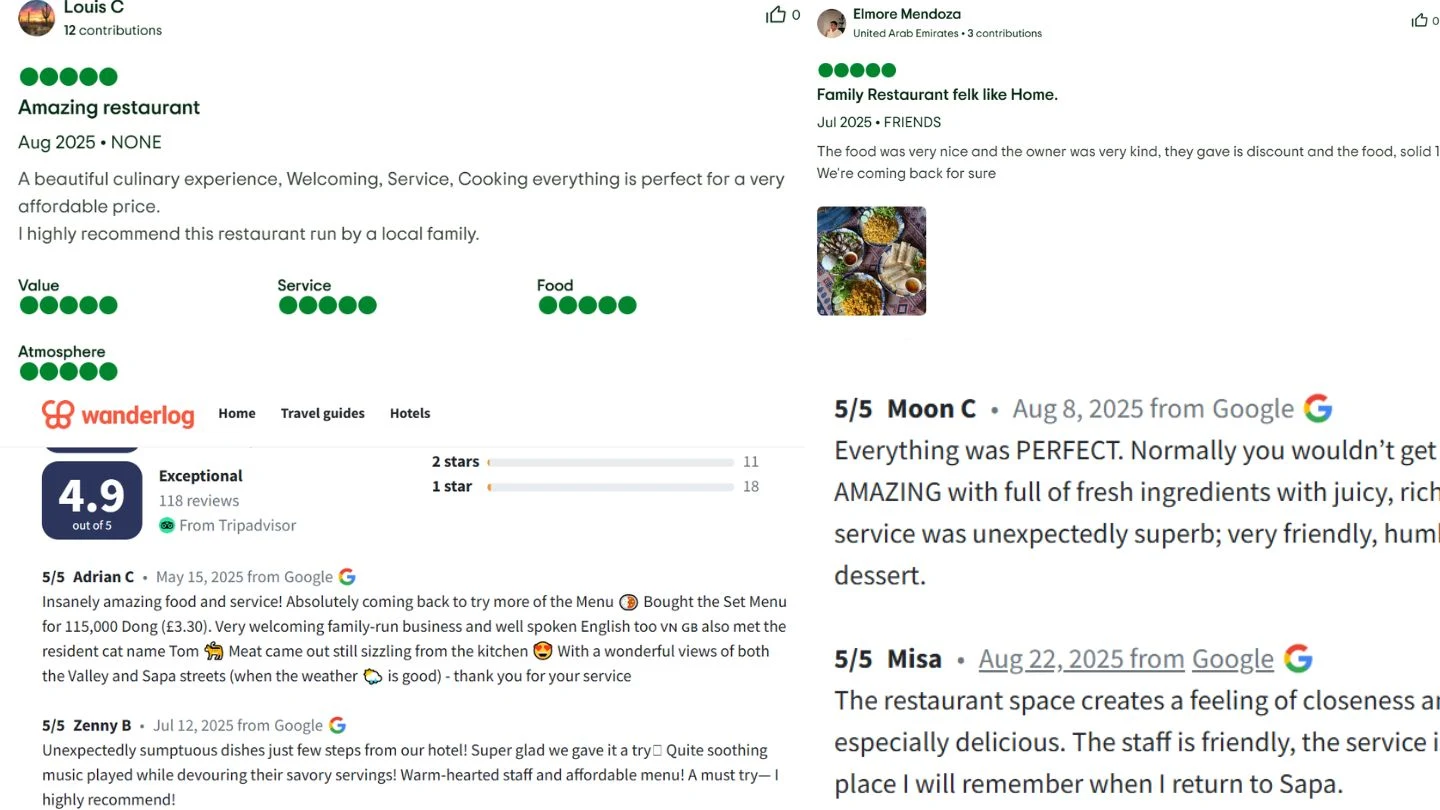 - Good portion sizes and reasonable value — many guests note generous portions and fair prices for the Sapa area.