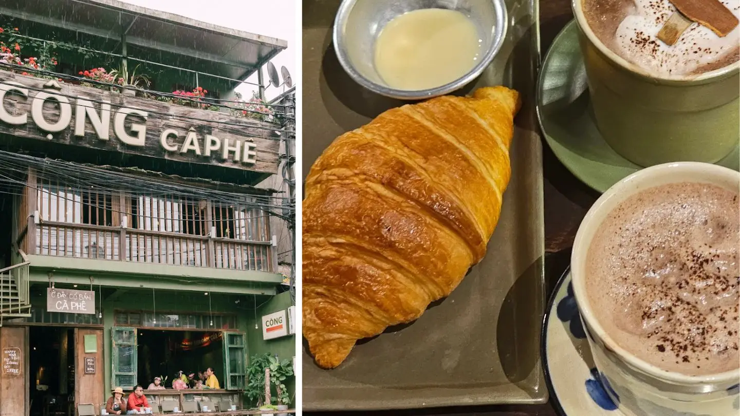 Cong Ca Phe may be known for its iconic coconut coffee, but it also serves fast food like Vietnamese baguette sandwiches and light pastries. You can pair these quick bites with your drink in a cozy, vintage-style cafe. The staff’s retro-themed uniforms add charm to the experience, making it feel warm and familiar.