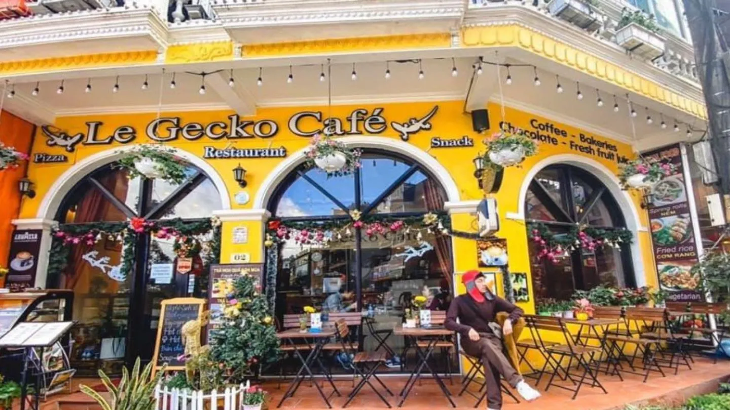 The exterior of Le Gecko Café Sapa stands out with its bright yellow façade and charming European-style design. Large arched windows framed with flowers and hanging plants create a cheerful, welcoming look. Outdoor seating with wooden tables and chairs invites guests to enjoy coffee while watching the lively town scene. The café’s warm colors, festive decorations, and cozy atmosphere make it an eye-catching spot in the heart of Sapa.