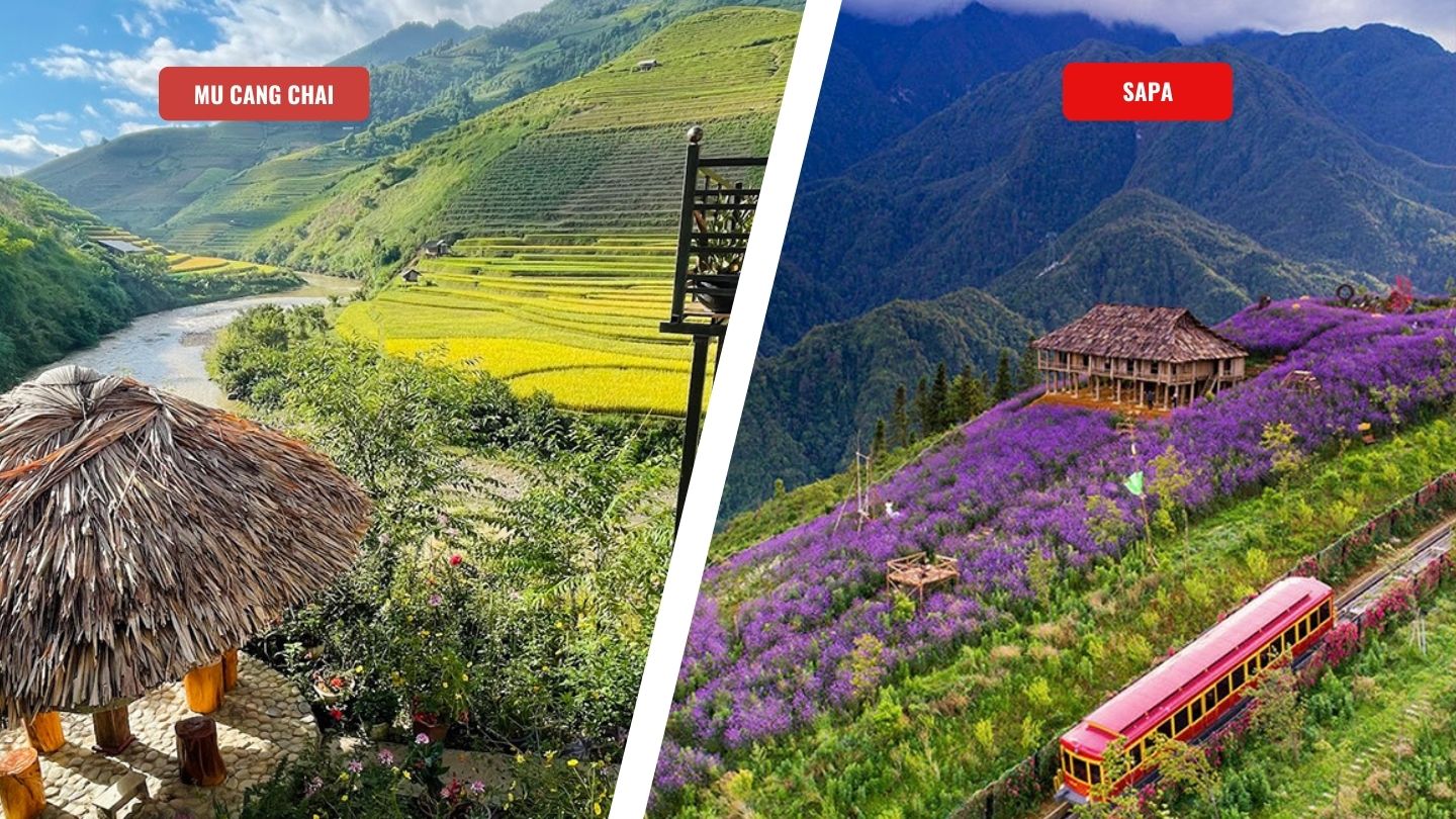 Nature & Highlights | Famous for golden terraced rice fields, Khau Pha Pass, peaceful scenery | Known for Fansipan Peak, Muong Hoa Valley, Ham Rong Mountain, vibrant landscapes |