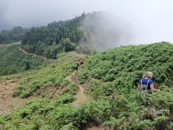 From the rear trail of the mount, descend toward Sau Chua, passing pine forest and hidden paths.