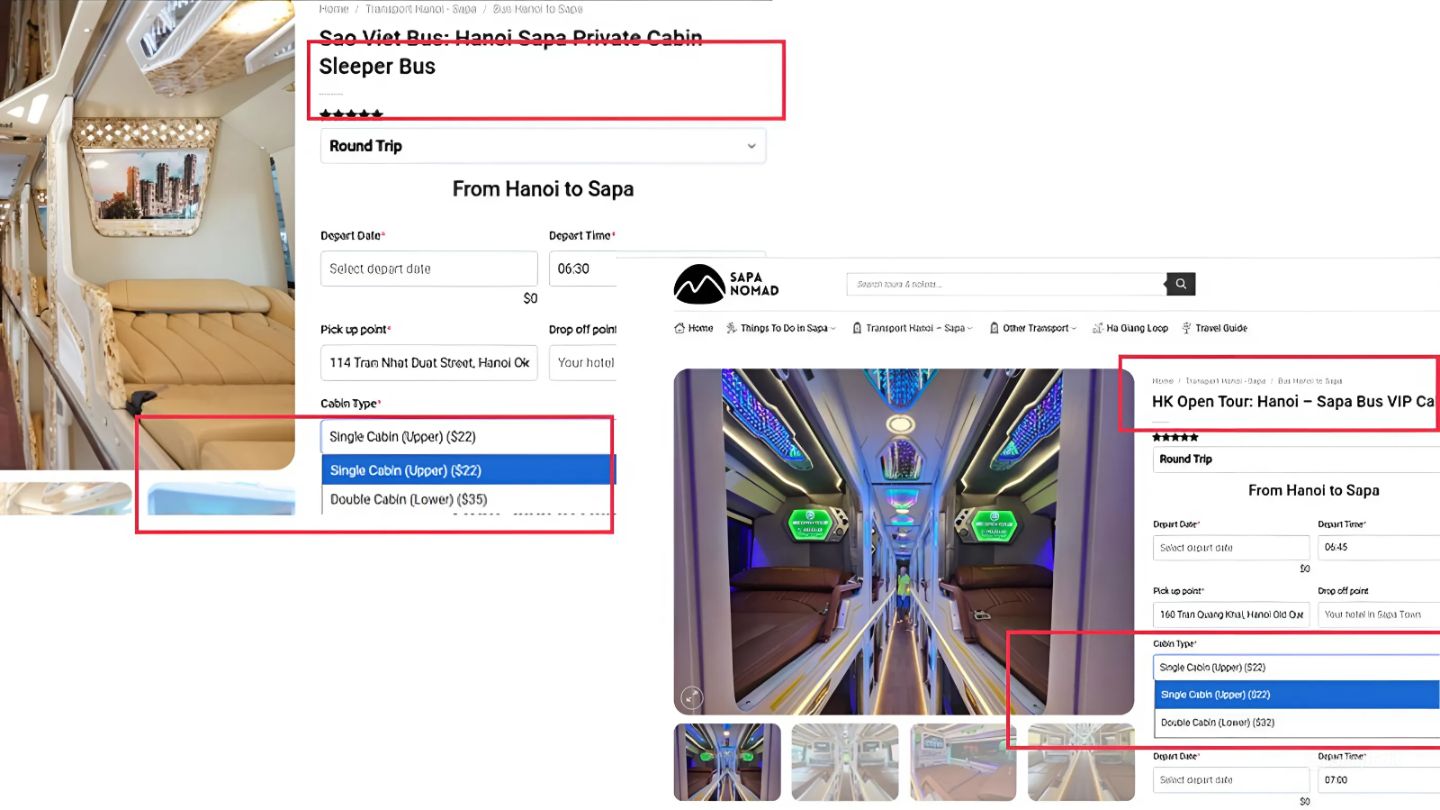 When we compare the prices between Sao Viet Bus and HK Open Tour, there are a few things to think about. For a single cabin on the upper deck, both buses cost $22. So, if you choose a single cabin, both are the same price.Â