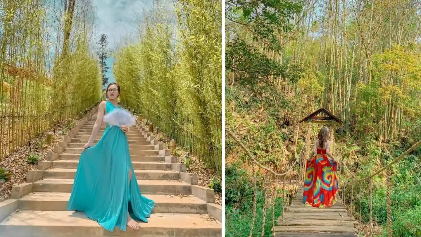 Walking through the bamboo forest feels like entering a fairy tale. Tall, straight bamboo shoots create a serene green tunnel, soft light shimmering through the leaves above. It’s a perfect place to take elegant, gentle photos – standing, walking, or even twirling in traditional attire. The atmosphere is cool, peaceful, and timeless, giving you a chance to capture dreamy, cinematic moments that feel utterly unique.