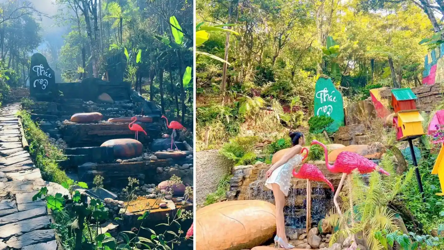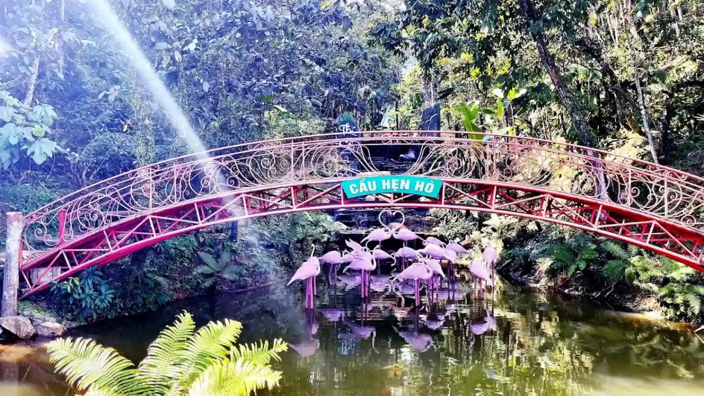 Hen Ho Bridge, located in the Green Valley of Sapa, is a charming red iron bridge with intricate decorative patterns. Set amidst lush greenery, the bridge spans a small pond filled with pink flamingo statues, some arranged in a heart shape, symbolizing love and romance. A sign reading “Cầu Hẹn Hò” (Dating Bridge) adds to its romantic allure. Sunlight streaming through the trees creates a magical atmosphere, making it a perfect spot for couples to take memorable photos and enjoy a peaceful, scenic escape in nature.