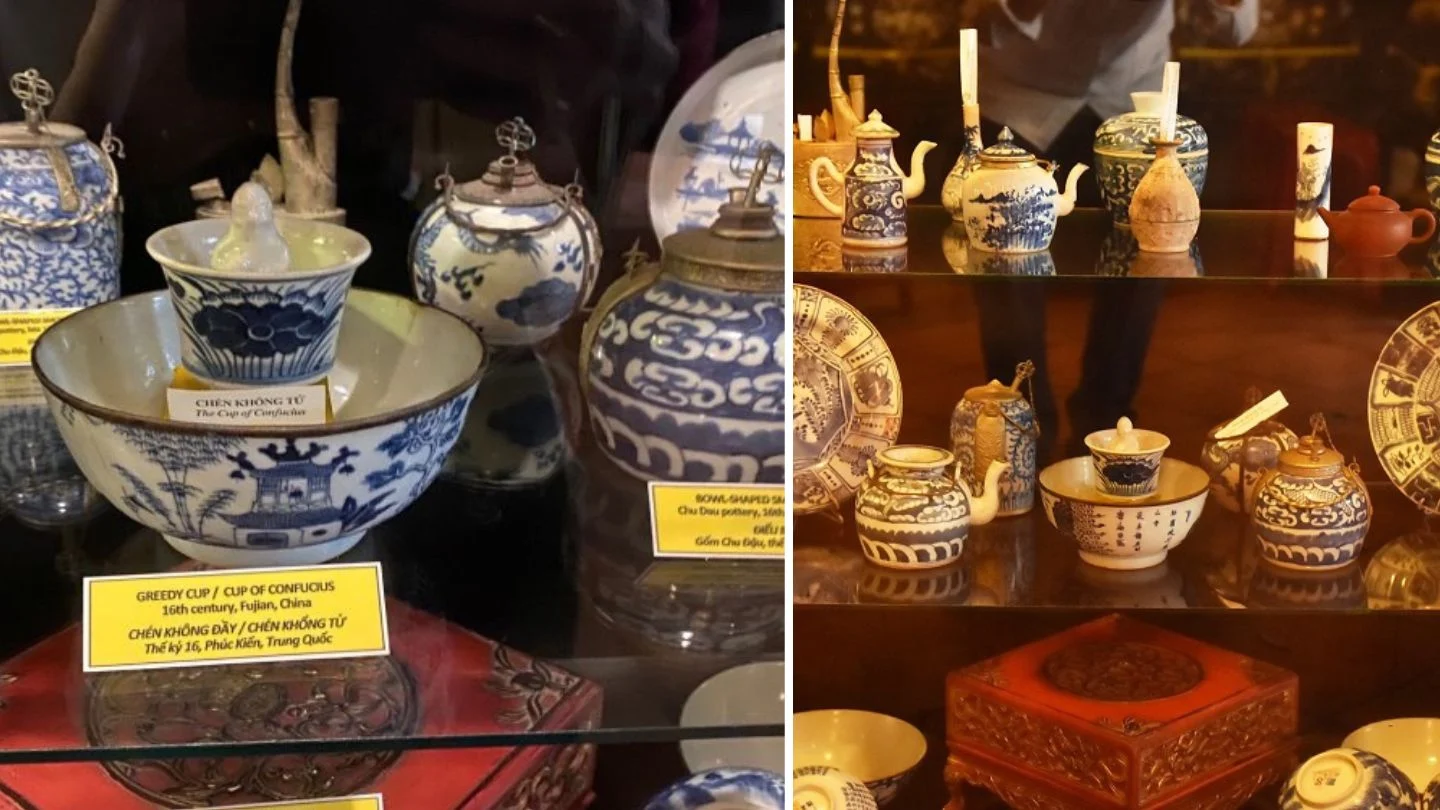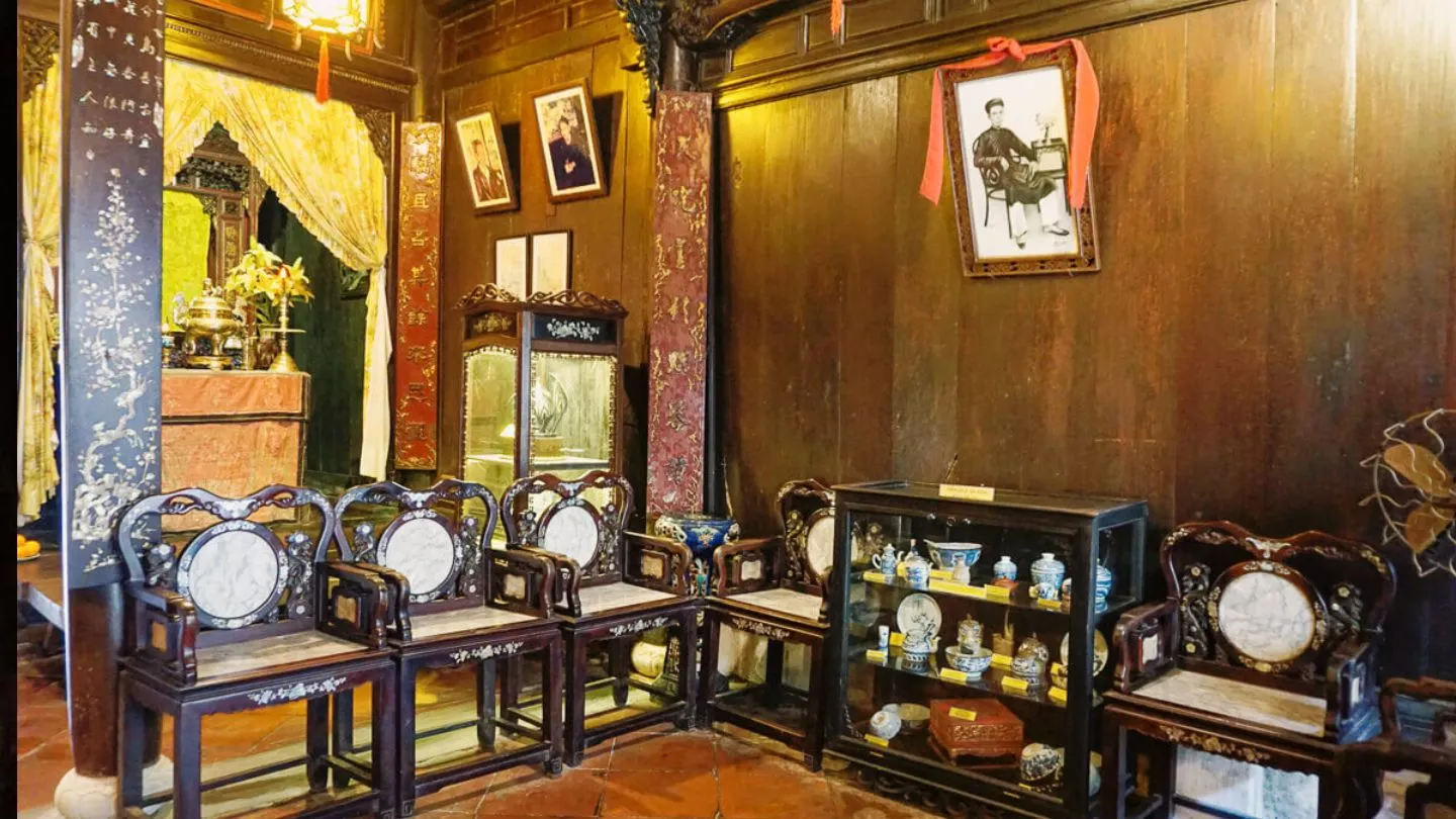 Walk through the halls and you’ll notice carved motifs – dragons, bats, pomegranates, peaches – each symbolizing good fortune, longevity, and prosperity in Vietnamese culture. The house also houses rare calligraphy panels and parallel sentences, alongside a stunning collection of heirloom antiquities: Chu Đậu ceramics, antique vases, teapots, wine jars, and even the epitaph of Lê Tấn Ký, the founder of the Tan Ky trading house