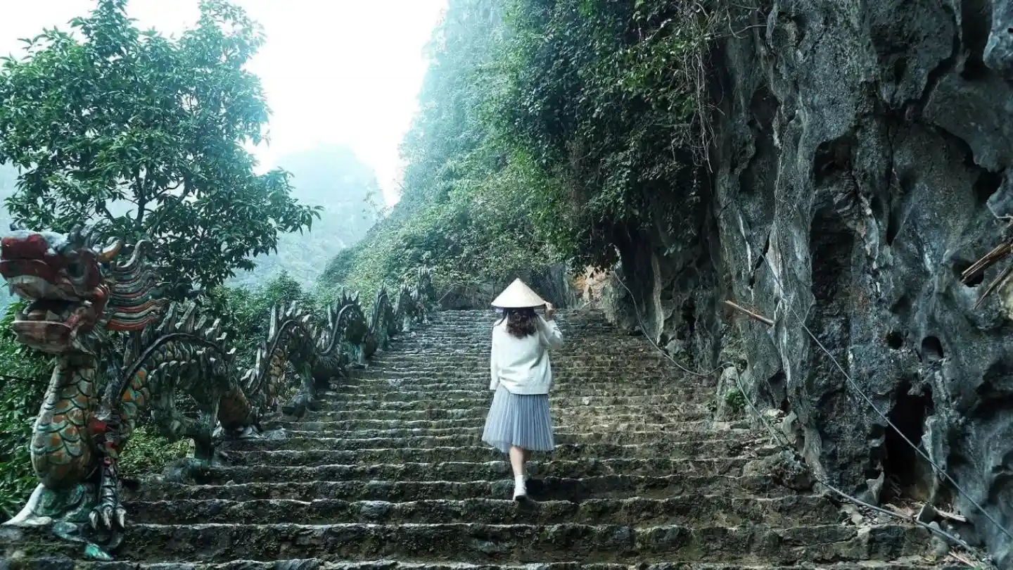 Just a short walk from the cave – around 200 steps – takes you to Am Tien Pagoda. This old pagoda has moss-covered walls and a peaceful, spiritual feel. It sits in the middle of nature, with green trees, birds singing, and rays of sunlight shining through the leaves. From here, you can even see the famous Bai Dinh Pagoda in the distance. It’s a great place to sit, rest, and take in the quiet beauty around you.