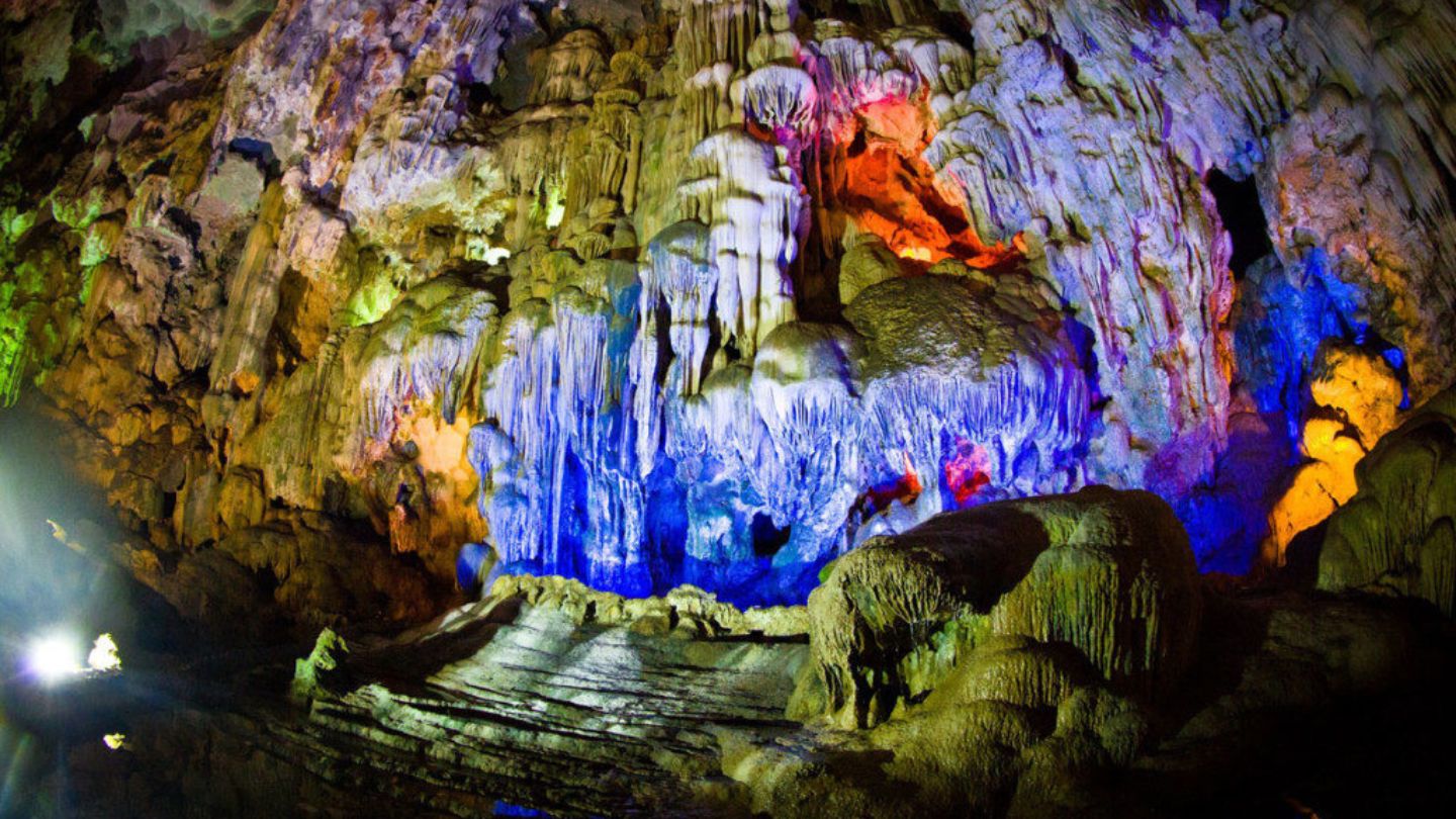 - Thien Cung Cave is the most beautiful. There’s a story that a Dragon King and his queen got married there. Today, colorful lights and sunshine through the cave’s roof make it feel like a fairy tale.