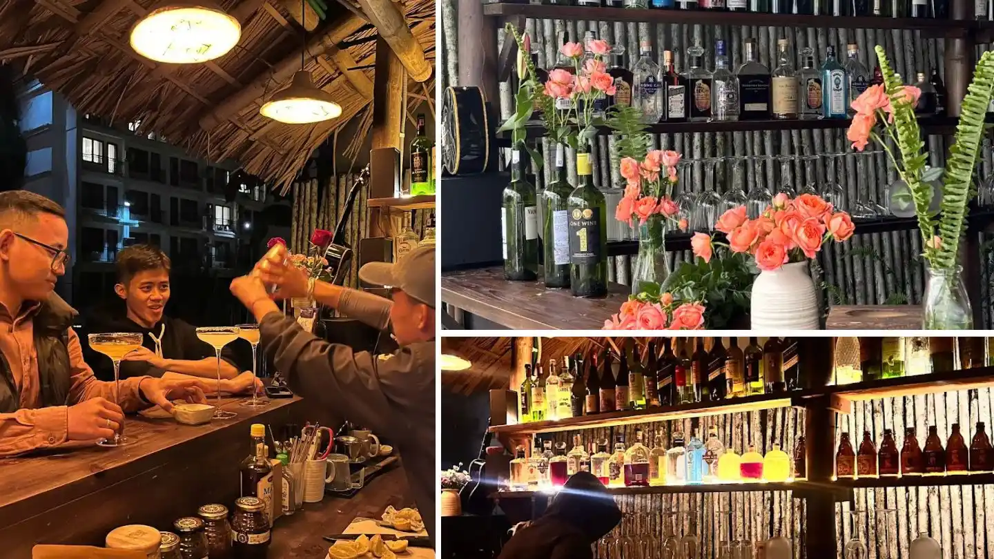 Whisper Hidden Bar Sapa exudes a warm and inviting atmosphere with a rustic, nature-inspired design. The thatched roof, soft amber lighting, and wooden furniture create a cozy and relaxed vibe. The bar is tastefully decorated with fresh flowers arranged in recycled wine bottles, adding a touch of creativity and charm.